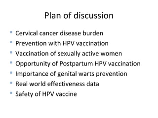 2) HPV vaccination aims to prevent cervical cancer by vaccinating against HPV types 16 and 18, which cause about 70% of cervical cancers. Vaccination is recommended for girls and women between ages 9-45 before sexual debut or exposure to HPV.