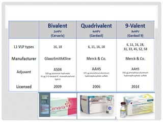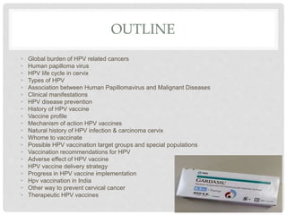 This document discusses HPV vaccines and cervical cancer prevention. It provides details on HPV types, transmission, and associated cancers. It outlines recommendations for HPV vaccination including target groups, dosing schedules, and delivery strategies. The goals of HPV vaccination are to reduce the global burden of HPV-related cancers through immunization programs.