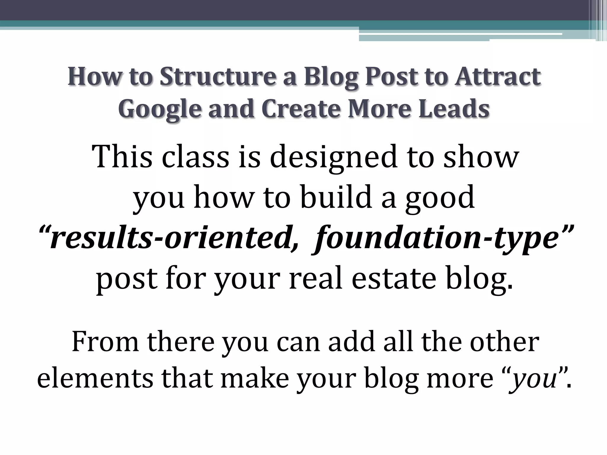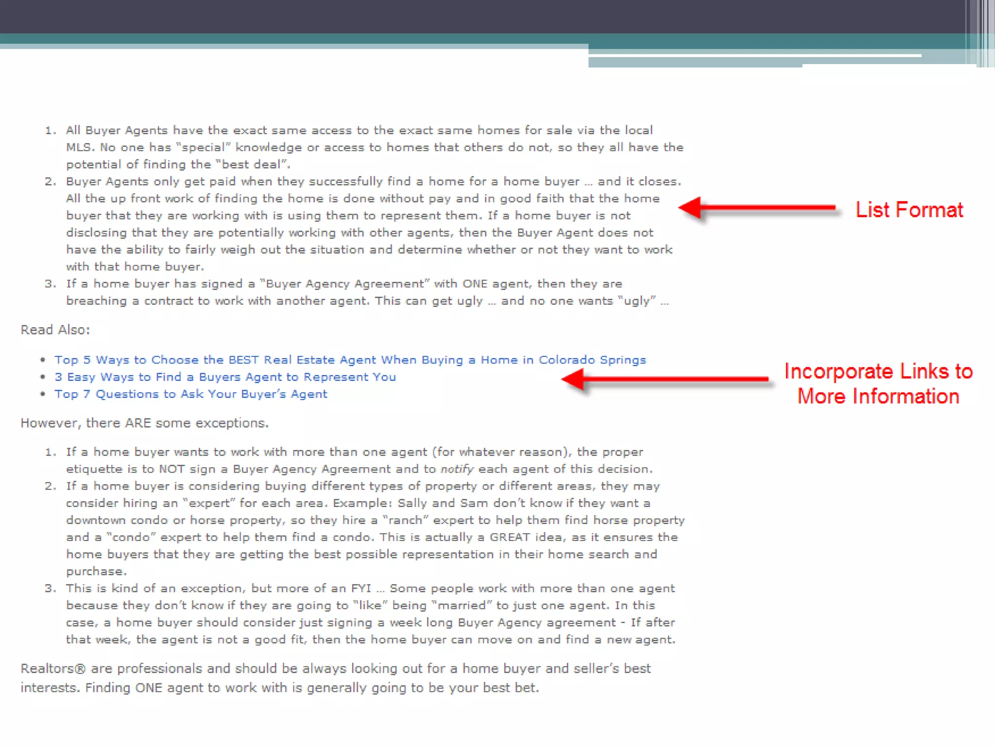 This document provides tips for structuring blog posts to attract search engines and generate more leads for a real estate business. It recommends using relevant titles that incorporate location-specific keywords and questions. The content should provide answers to consumer questions, tools to help them reach their goals, and showcase expertise. Images, lists, and links can break up the text. Posts should be categorized broadly and tagged with specific keywords to aid discoverability. The conclusion should summarize key points and include calls to action like contact forms. Following these guidelines can help posts appeal to both consumers and search engines.