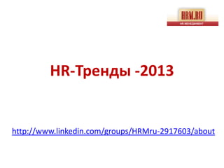 Документ обсуждает HR-тренды 2013 года, сосредоточенные на управлении талантами, в частности, выделяя смену парадигмы с использования традиционных методов на основанные на данных подходы. Большое внимание уделяется тому, как компании, такие как страховая, использовали поведенческие оценки для повышения рабочей эффективности, подтвердив, что традиционные методы подбора не всегда срабатывают. Также рассматриваются новые компетенции в сфере HR и изменения в подходах к корпоративным тренингам.