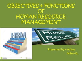 This document outlines the objectives and functions of human resource management. It discusses 10 objectives of HRM which are to help the organization attain its goals by providing well-trained employees, employ skills efficiently, enhance job satisfaction, establish productive relationships, develop members, maintain work quality, high morale, ethical policies, recognize individual and group goals, and manage change. It also describes the managerial and operative functions of HRM which include planning, organizing, staffing, directing, controlling, procurement, development, compensation, integration, and maintenance.