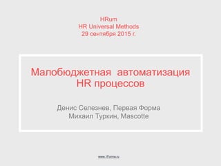 Документ обсуждает малобюджетную автоматизацию HR процессов, акцентируя внимание на необходимости внедрения фиксированных сроков ответа на запросы и контроля эффективности работы сотрудников. Упоминаются основные задачи HR и IT, а также трудозатраты как инструмент для повышения производительности. Описываются преимущества автоматизации бизнес-процессов, включая упрощение согласований и улучшение коммуникации.