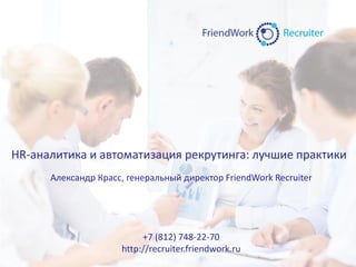 Документ описывает преимущества автоматизации рекрутинга с помощью сервиса friendwork recruiter, который помогает рекрутерам сократить время на закрытие вакансий и повысить эффективность работы. Сервис предлагает аналитические инструменты для отслеживания и анализа кадровых процессов, включая отчеты о кандидатах, причины отказов и эффективность источников. В результате использования friendwork recruiter, компании могут значительно сэкономить время и улучшить качество подбора персонала.