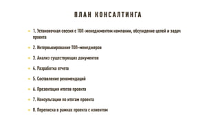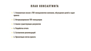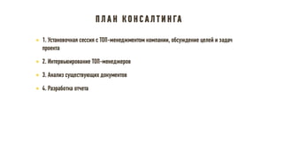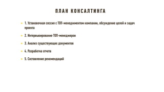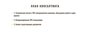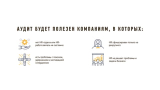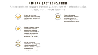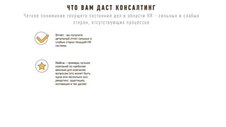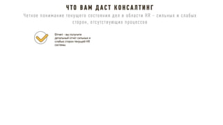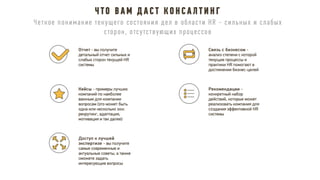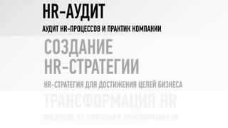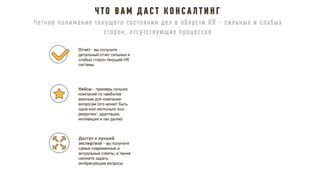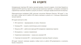 Документ описывает принципы и стратегии эффективного функционирования HR-департамента, включая элементы взаимодействия с бизнесом, трансформацию HR модели, управление изменениями и внедрение лучших практик. Рассматриваются ключевые направления, такие как снижение текучести кадров, повышение удовлетворенности сотрудников и участие HR в достижении бизнес-результатов. Также акцентируется внимание на внедрении современных методов и технологий для оптимизации HR процессов и улучшения взаимодействия с сотрудниками.