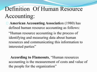 This document discusses human resource accounting, which involves identifying, measuring, and reporting on the value of human resources within an organization. It defines human resource accounting and provides characteristics, objectives, methods, advantages, disadvantages, limitations. The key objectives are to facilitate management of human resources, provide information on the value of human resources to investors and other stakeholders, and evaluate return on investment in human capital. Common valuation methods include historical cost, replacement cost, opportunity cost, and economic valuation. Advantages include improved decision making and human resource management, while limitations relate to the difficulties in valuing human resources and lack of standardized valuation methods.