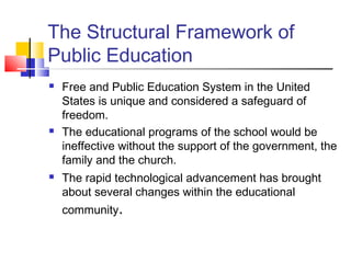 The document discusses the structural framework of public education in the United States, including the responsibilities of federal, state, and local governments. It also summarizes the roles and responsibilities of school boards and superintendents in establishing policies and administering schools. Finally, it addresses the goals and functions of human resources administration in education.