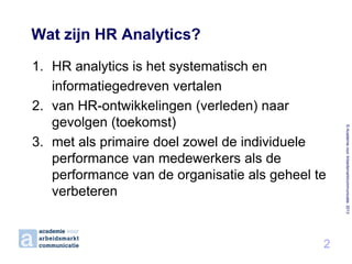 Analytics? 2 © Academie voor Arbeidsmarktcommunicatie 2013 1. HR analytics is het systematisch en informatiegedreven vertalen 2. van HR-ontwikkelingen (verleden) naar gevolgen (toekomst) 3. met als primaire doel zowel de individuele performance van medewerkers als de performance van de organisatie als geheel te verbeteren