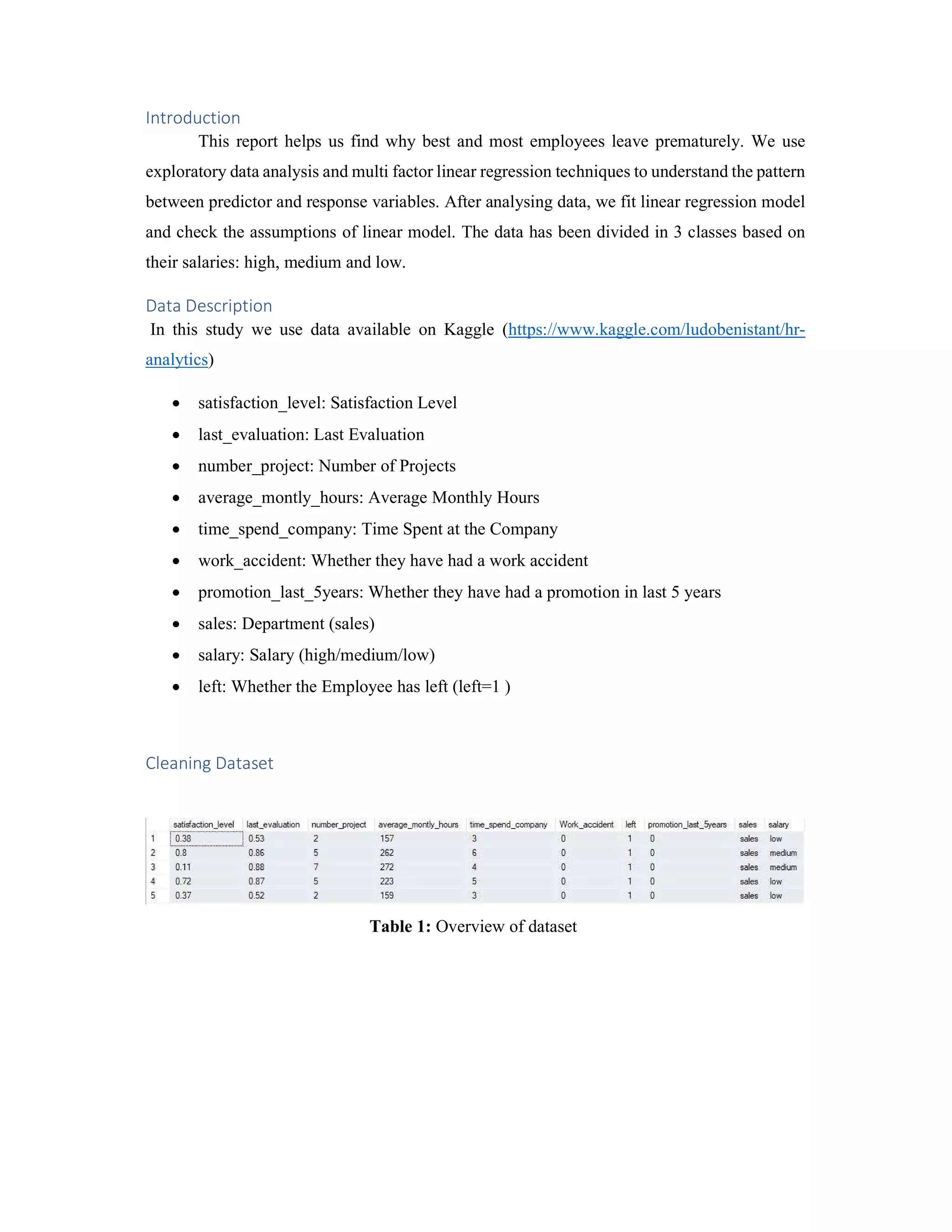 This report analyzes employee data to understand why employees leave companies. It explores relationships between variables like satisfaction level, projects handled, work accidents, and likelihood of leaving. It finds that higher satisfaction levels and more time at a company correlate with lower chances of leaving, while more projects and work accidents correlate with higher chances. The best predictor of leaving is satisfaction level. Employees handling over 4 projects or with satisfaction below 0.5 often leave.