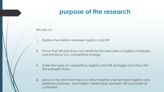 The document discusses the relationship between human resource management, logistics strategies, and competitive strategies. It aims to explore how HR practices can facilitate logistics strategies and enhance a company's competitive advantage. It finds that differentiation strategies are linked to market-oriented logistics strategies and maximum commitment HR strategies, while cost leadership strategies are linked to cost-oriented logistics strategies and cost reduction HR strategies. Specifically, market-oriented logistics requires flexible, skilled workers managed with maximum commitment HR practices, while cost-oriented logistics requires standardized work with low-skilled workers managed under cost reduction HR practices. In summary, the document demonstrates the direct relationships between logistics and customers, and between HR and internal customers, as well as the indirect