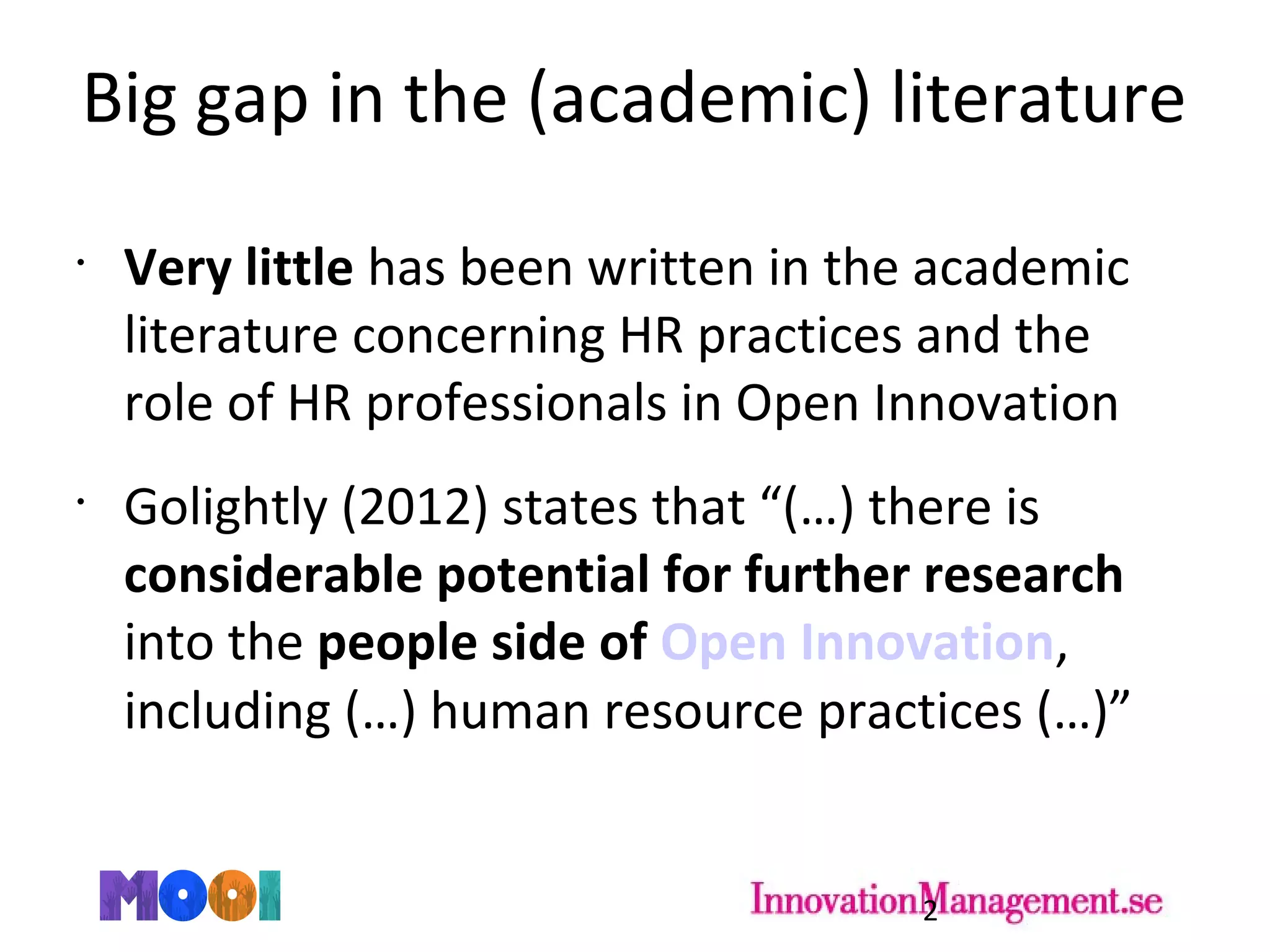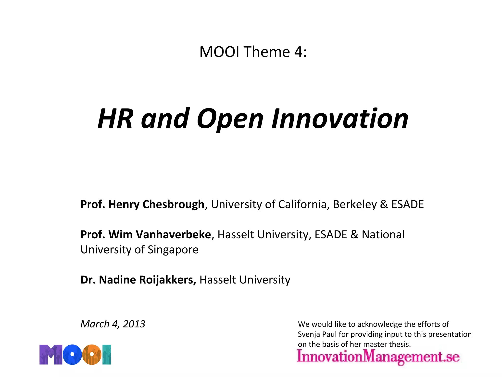 The document discusses the critical role of human resource (HR) practices in fostering open innovation, emphasizing that the success of open innovation largely depends on people and their attitudes. It highlights necessary skills for open innovation, the importance of both internal and external talent management, and the evolving role of HR in supporting organizational processes related to innovation. The authors advocate for strategic HR practices that enhance talent connectivity and proactively engage individuals in the innovative process.