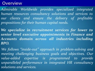 Admirable Worldwide provides HR consultancy and executive recruitment services. They specialize in recruiting lower to senior level executives for finance and accounting roles across industries. They follow an "inside-out" problem-solving approach to meet business goals and objectives. Their services aim to reduce costs, save time, and provide clients with a wide range of qualified candidates and expertise in the finance and accounting domain.