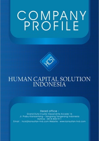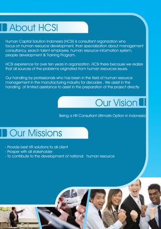 Human Capital Solution Indonesia (HCSI) is a consulting organization specializing in human resource development, management consultancy, talent search, and training programs. With over ten years of experience, HCSI aims to provide effective HR solutions and improve organizational performance through customized services. Their offerings include employee evaluation, people development, HR information systems, and various training programs to enhance workforce competencies.