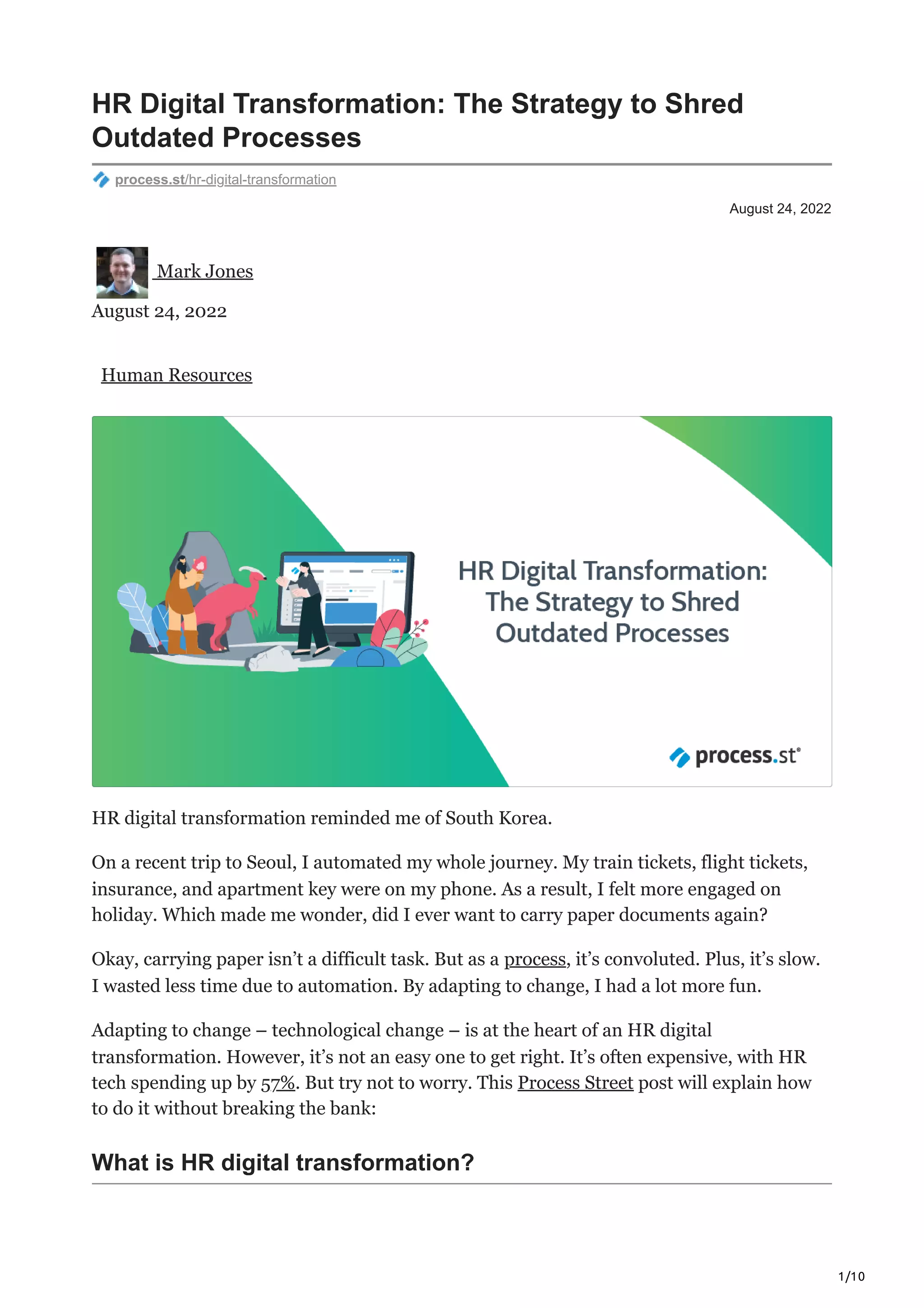 The document discusses HR digital transformation, emphasizing the need to automate outdated processes to improve efficiency and employee engagement. Key benefits include saving time, easier access to documents, and better teamwork, achieved through careful planning and involving the entire organization. A five-step roadmap is provided for successful implementation, showcasing examples like HR chatbots and self-service portals to enhance operations.