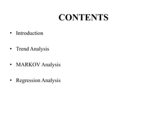 This document discusses various techniques for human resource forecasting, including trend analysis, Markov analysis, and regression analysis. Trend analysis uses past trends to predict future needs based on historical attrition rates. Markov analysis tracks employee movement within an organization using transition matrices to forecast internal labor supply. Regression analysis develops mathematical equations to analyze the relationship between dependent and independent variables, such as using sales and new customers to predict future full-time employees needs. These techniques help organizations project future human resource demands and how to meet staffing needs.