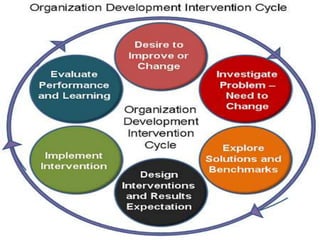 Human resource interventions aim to help organizations improve performance and effectiveness. There are different types of interventions, including individual-based interventions like training and coaching, group-based interventions like team building, and inter-group interventions like conflict resolution. Effective interventions fit the organization's needs, are based on causal knowledge of intended outcomes, and transfer change-management skills to members. Designing effective interventions depends on factors like individual differences, organizational readiness for change, and the capabilities of the change agent.