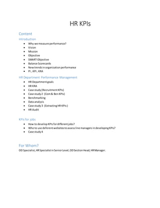 The document covers various aspects of HR performance measurement including the importance of KPIs and objectives, the vision and mission of HR departments, and how to develop effective KPIs for different jobs. It includes case studies on recruitment, compensation, and benefits, as well as methodologies for benchmarking and data analysis. Additionally, it provides guidance for HR and organizational development specialists on assessing and developing KPIs.