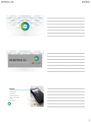 The document provides an overview of HR metrics, emphasizing their importance in understanding workforce performance and making data-driven decisions. Key topics include recruitment effectiveness, compliance with regulations, cost analysis of hiring sources, and the significance of employee engagement. It also outlines best practices for gathering HR data and measuring various employee indicators to enhance organizational health.