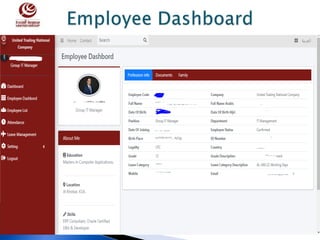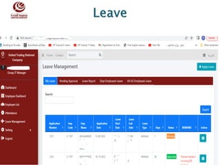 The document describes a human resource portal that provides an online system for employers to track employees. It allows for faster access to HR information across branches and easy installation/use. The portal includes features like attendance tracking, leave management, self-service functions, and reports.
