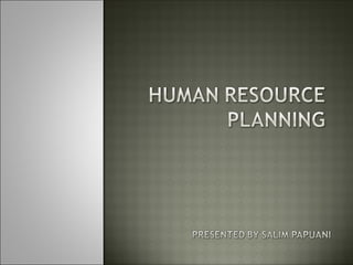 The document discusses human resource planning (HRP), which includes forecasting future demand and supply of human resources. It describes various demand forecasting methods like managerial judgment, work study, and Delphi technique. Supply forecasting involves assessing internal and external sources of employees. The key aspects of HRP are identifying vacancies, recruiting and selecting the right people at the right time to achieve organizational objectives. HRP is an important process but faces challenges due to lack of integration with overall business strategy and conflicting time horizons.
