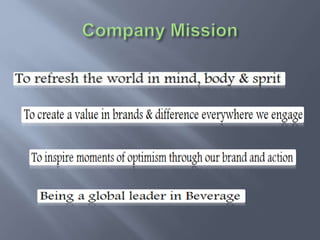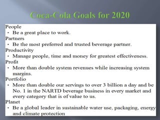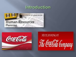 This presentation discusses human resource planning at Coca Cola Company. It explains that the company forecasts future needs, including positions that will require new skills and knowledge, and whether those positions will be filled internally or externally. The presentation also notes that Coca Cola developed HR policies and procedures early on to anticipate future human resource needs. It concludes with recommendations.