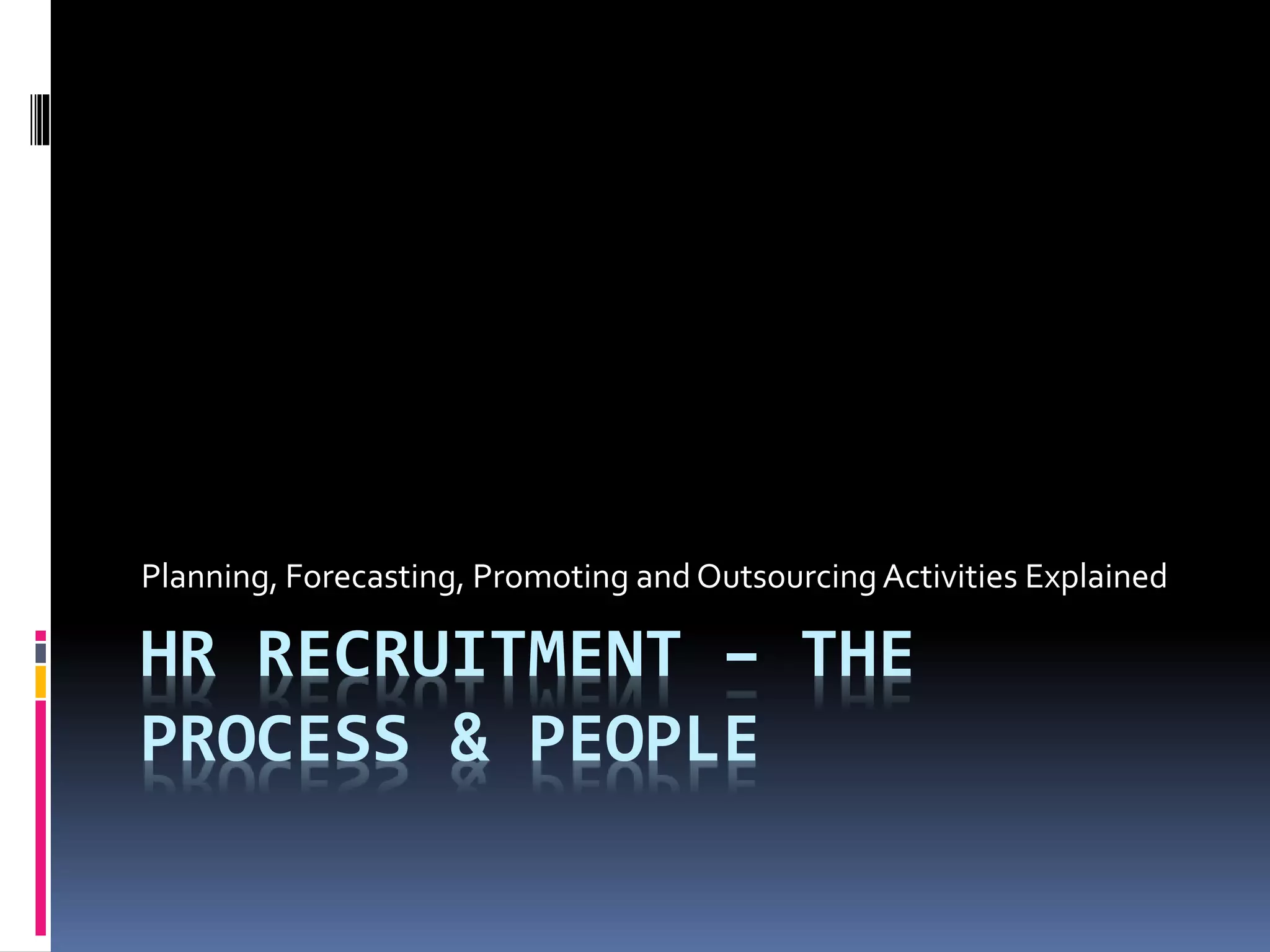 This document discusses HR recruitment and planning processes. It explains that HR planning involves forecasting needs, setting goals and evaluating programs. The key steps in HR planning are assessing needs, forecasting demand and supply, matching them, and creating action plans. Effective recruitment methods include interviews, screening, aligning with strategies, and creating talent pools. Outsourcing HR can provide experienced professionals, better benefits, reduced costs, and help with legal compliance and risk management.