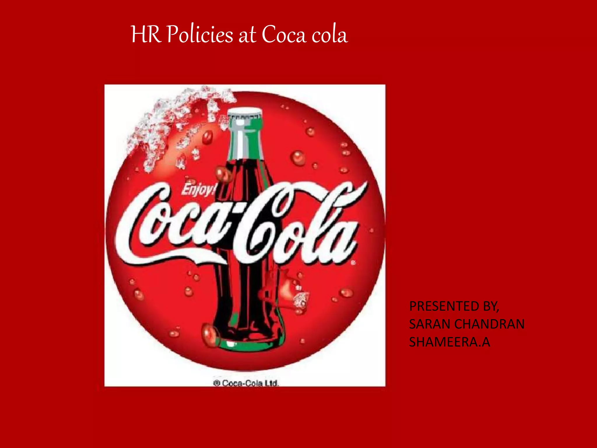 The document summarizes HR policies at Coca Cola, including policies around training, wages, leaves, medical facilities, mentoring, recruitment, performance appraisal, compensation and benefits, employee relationships, and safety. New employees receive special training and are paired with experienced employees. Employees receive competitive wages and various facilities and benefits. The company fosters a good work culture and motivates employees through various programs.