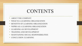 Wipro is a global IT company that emphasizes learning and development. It spends 1% of revenue on training through programs like Project Readiness for new recruits and Manager Excellence Framework for experienced employees. Wipro aims to be a learning organization by encouraging knowledge sharing and adapting to changes. It has received multiple awards for its learning practices. The company also focuses on social responsibilities through the Azim Premji Foundation, which works to improve education in India.