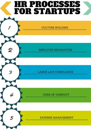 This document provides guidance for establishing core HR processes for startups and small-to-medium enterprises. It outlines 9 key areas that should be addressed, including culture building, employee separation, labor law compliance, compensation structure, working hours and leave policies, recruitment and selection of employees, and probation reviews. The document stresses that designing simple and easy to understand HR processes can help startups address many people management challenges, and that the spirit of implementing these processes is critical to their success.