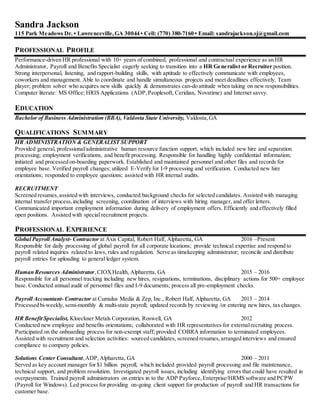 Sandra Jackson is an experienced HR professional with over 10 years in various HR roles, currently seeking a transition into HR generalist or recruiter positions. She has a strong background in payroll processing, recruitment, and HR administration, with skills in managing confidential information and conducting employee orientations. Her professional experience spans roles at multiple organizations, focusing on employee tracking, payroll analysis, and compliance with HR regulations.