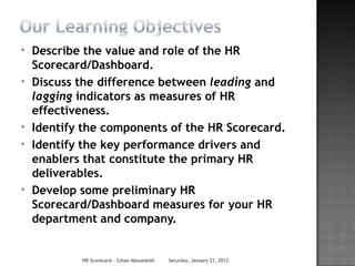 The document discusses the HR scorecard and dashboard. It provides information on: