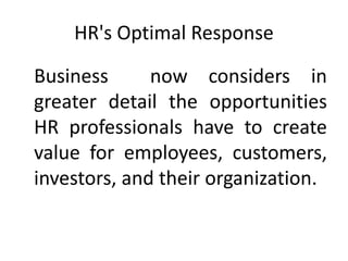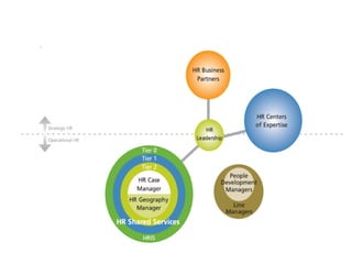 The document discusses the evolution of HR service delivery models, highlighting a shift towards strategic partnerships and operational excellence. It outlines three primary HR delivery models: centralized, decentralized, and account management, and emphasizes the importance of service strategy development and financial management for HR services. Additionally, it introduces a multi-tiered HR service delivery approach to improve efficiency in operations and employee relations.