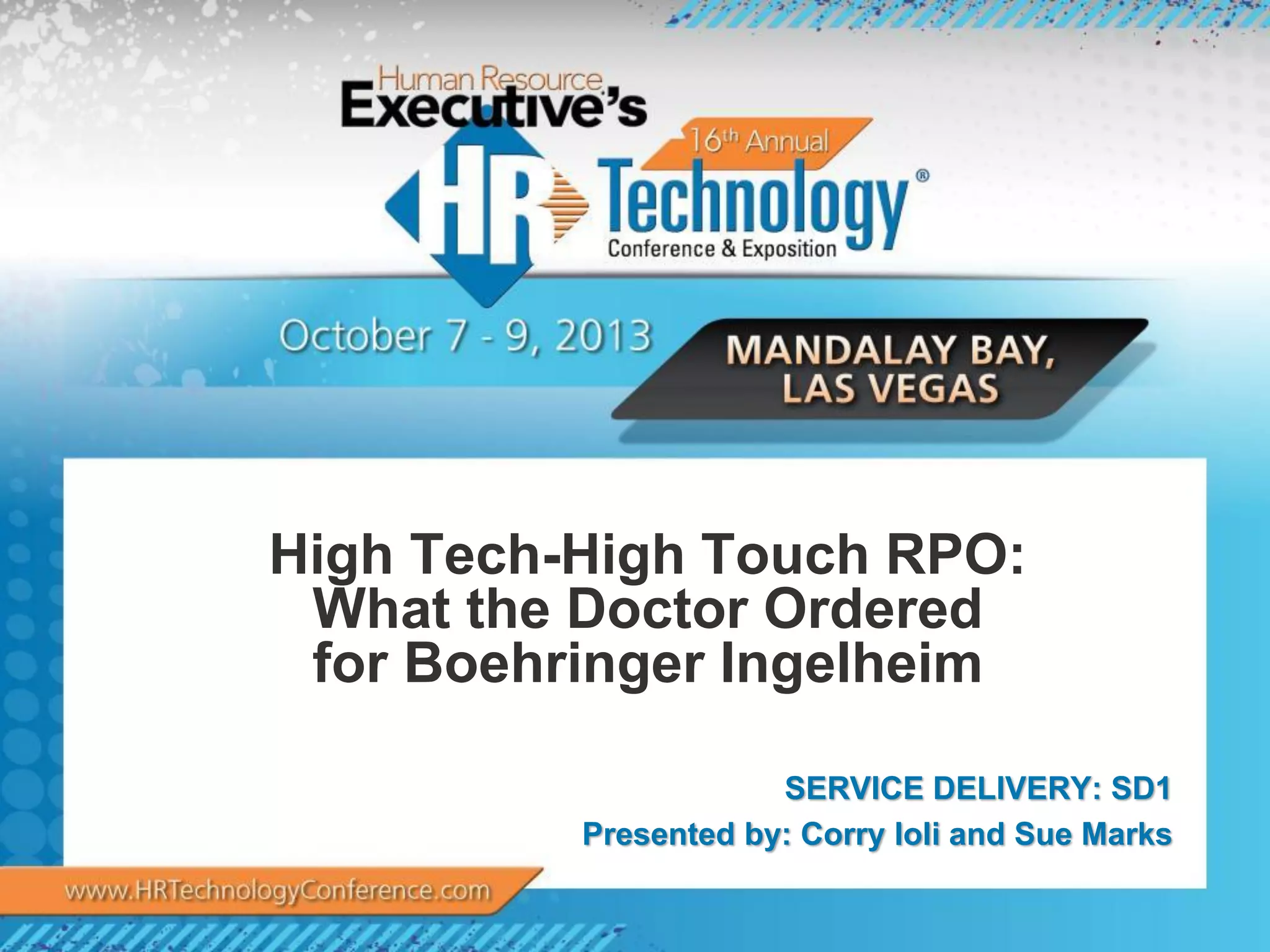The presentation discusses Boehringer Ingelheim's talent management and acquisition strategies, emphasizing the importance of ongoing employee development, diversity, and a consultative partnership with RPO provider Pinstripe. It highlights the tailored approach to recruitment, performance metrics, and the company's commitment to enhancing its employer brand and candidate experience. The document outlines the success and challenges of their RPO partnership while focusing on data-driven decision-making for future talent acquisition efforts.