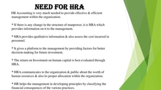 Human resource accounting is an attempt to identify and report investments made in an organization's human resources, which are not currently accounted for in conventional accounting practices. It involves measuring the costs incurred by organizations to recruit, select, hire, train and develop employees, and determining the economic value of human resources to the organization. Proponents argue it provides benefits like helping ascertain return on investment in employees, indicating labor intensity, and providing information to investors. However, it also faces limitations such as lack of a single agreed-upon valuation method, uncertainty around employee tenure, potential for exploitation, and lack of perfect knowledge about future returns from human resources. The concept has evolved over several stages from initial academic interest to widespread research and experiments by organizations, followed