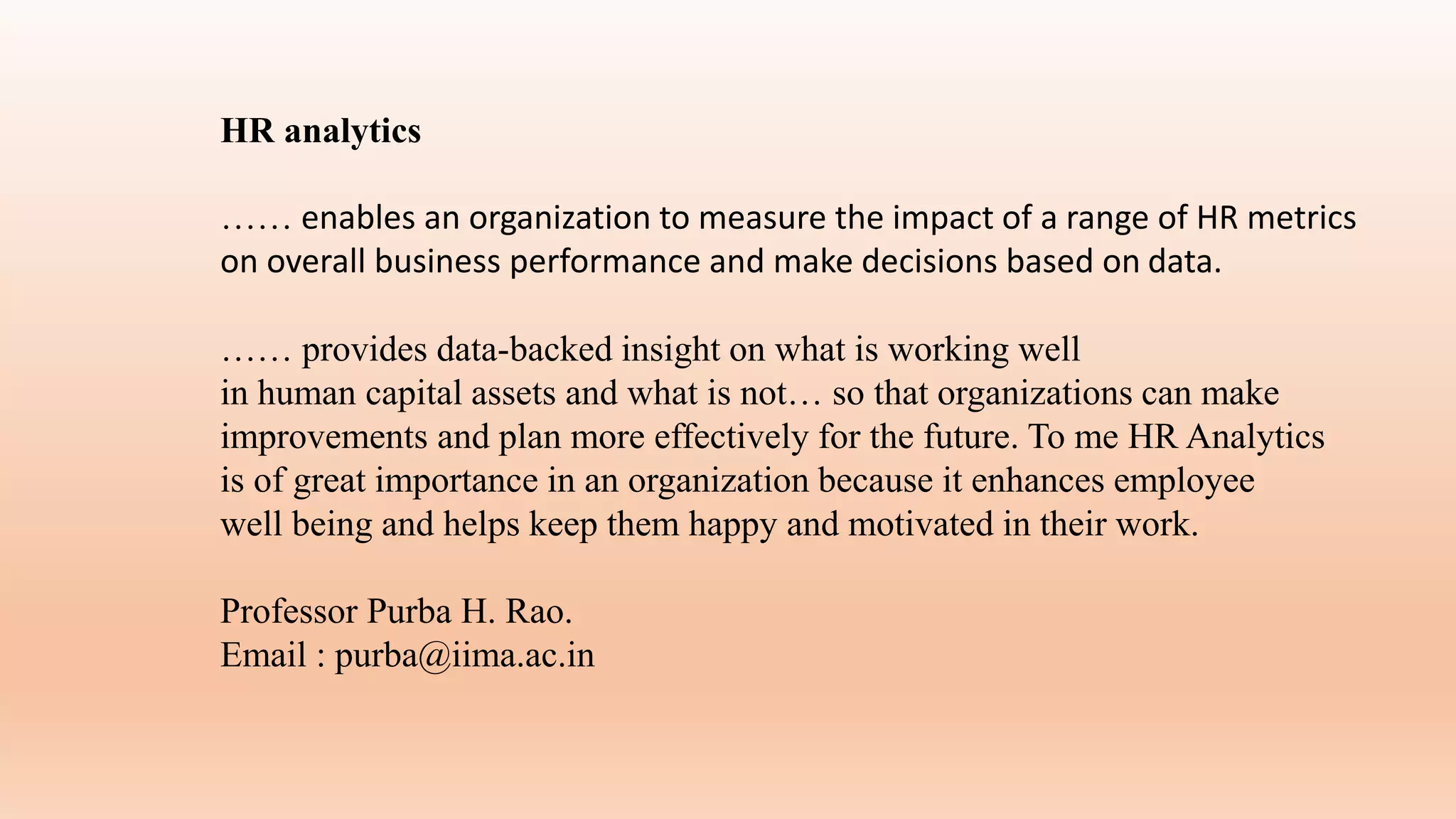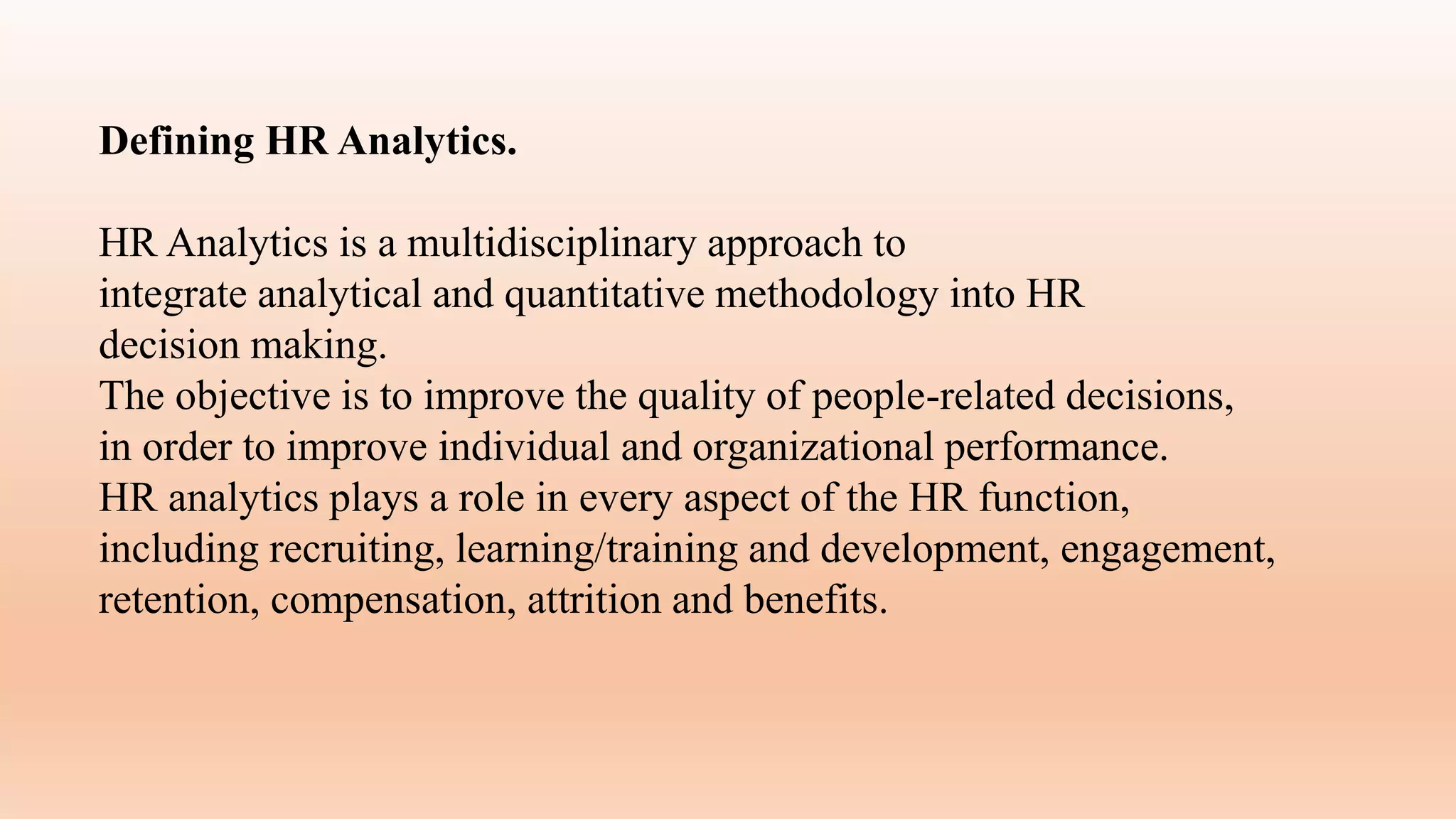 The document discusses HR analytics and its importance in organizations. It provides definitions of HR analytics as a multidisciplinary approach that uses quantitative methods to improve HR decision making and organizational performance. It discusses how HR analytics can be applied across the HR lifecycle including recruitment, learning and development, engagement, retention and other areas. Analytical models that can be used include skills gap analysis, principal component analysis, cluster analysis, and Kirkpatrick model for evaluating training impact. Measuring employee engagement and calculating an engagement score is also discussed as a way to assess organizational performance and drive business outcomes.