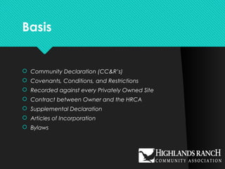 The document outlines the duties, responsibilities, and expectations of HRCA Delegates and Directors. Delegates elect Directors and have authority to approve certain assessments and amendments with 2/3 voting approval. Directors' duties include accepting property, maintaining insurance, preparing budgets, enforcing rules and collecting assessments. Their powers include acquiring property, adopting rules, and conveying property with Delegate approval. Directors are responsible for finances, architectural matters, and representing the HRCA. They have fiduciary duties and can face corporate or personal liability.
