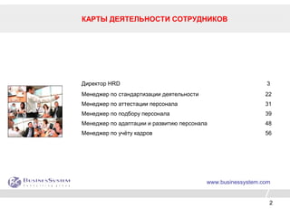 Документ представляет собой профессиональный стандарт деятельности сотрудников HRD, включая их цели, задачи и алгоритмы выполнения. Он содержит информацию о KPI, методах аттестации и отбора персонала, а также о процессах адаптации и развития сотрудников. Также описываются формы информационного обмена и отчетности в рамках компании.