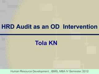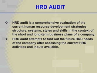 The document discusses HRD audits, which comprehensively evaluate an organization's human resource development strategies, structures, systems, styles, and skills. An HRD audit assesses current HRD activities and inputs to determine future needs. It answers questions about business plans, HRD staff competencies, existing HRD systems and their effectiveness, structural adequacy, and management styles. Auditors use interviews, questionnaires, observation, and document analysis. Results are scored across four dimensions to produce an HRD scorecard rating HRD maturity. HRD audits function as organizational development interventions and research studies show factors like management commitment influence their effectiveness in driving changes.