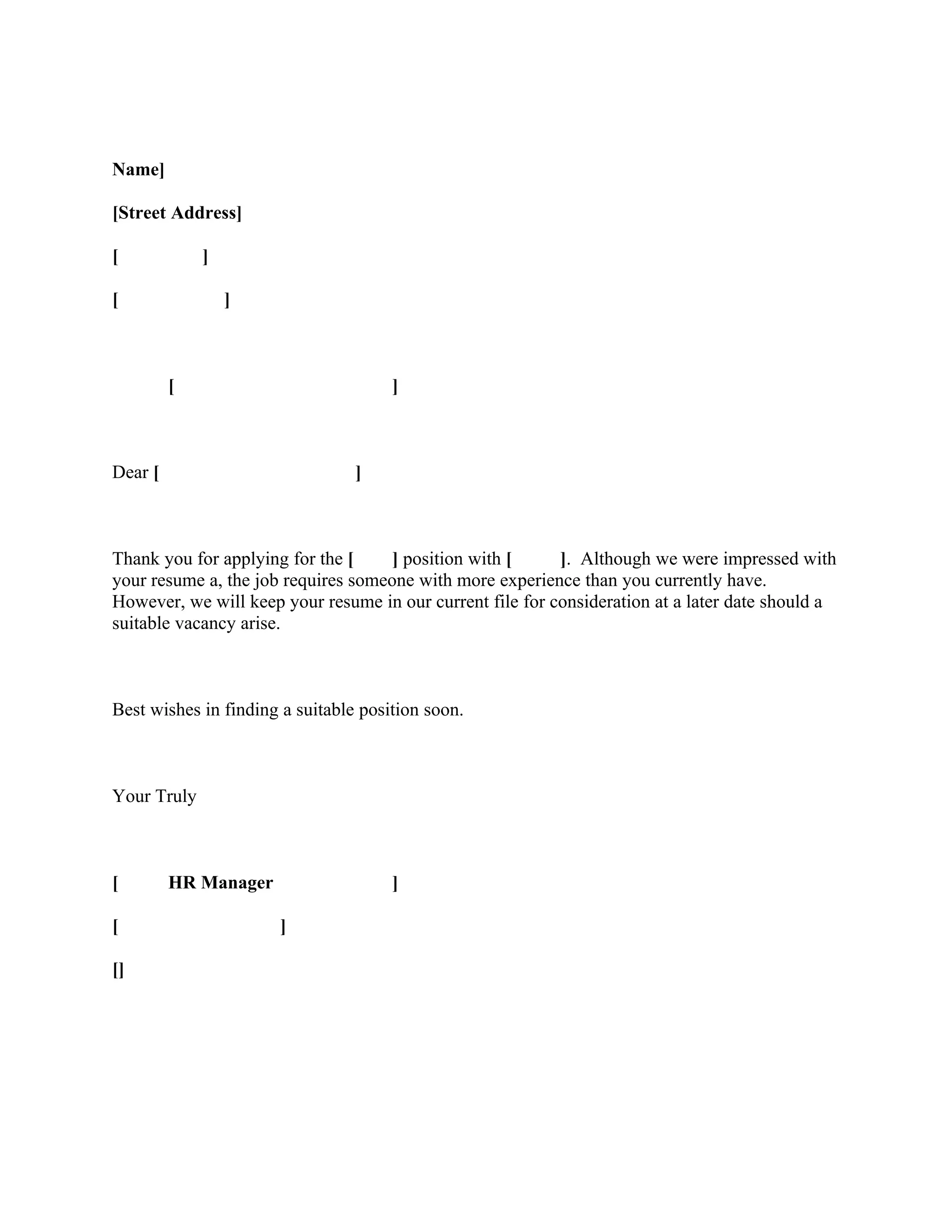 This letter thanks an applicant for applying for a position but informs them that they did not get the job because they lacked the required experience. However, the applicant's resume will remain on file in case a more suitable position becomes available in the future. Best wishes are expressed in finding a suitable position soon.