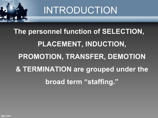 The document discusses various aspects of staffing such as placement, induction, promotion, succession planning, and career development. It provides details on properly introducing new employees to their roles and organizations, developing employees for higher level positions, identifying and training potential successors, and supporting employees' careers over different stages from early to late career. The goal is to effectively manage human resources and maximize employee and organizational performance.