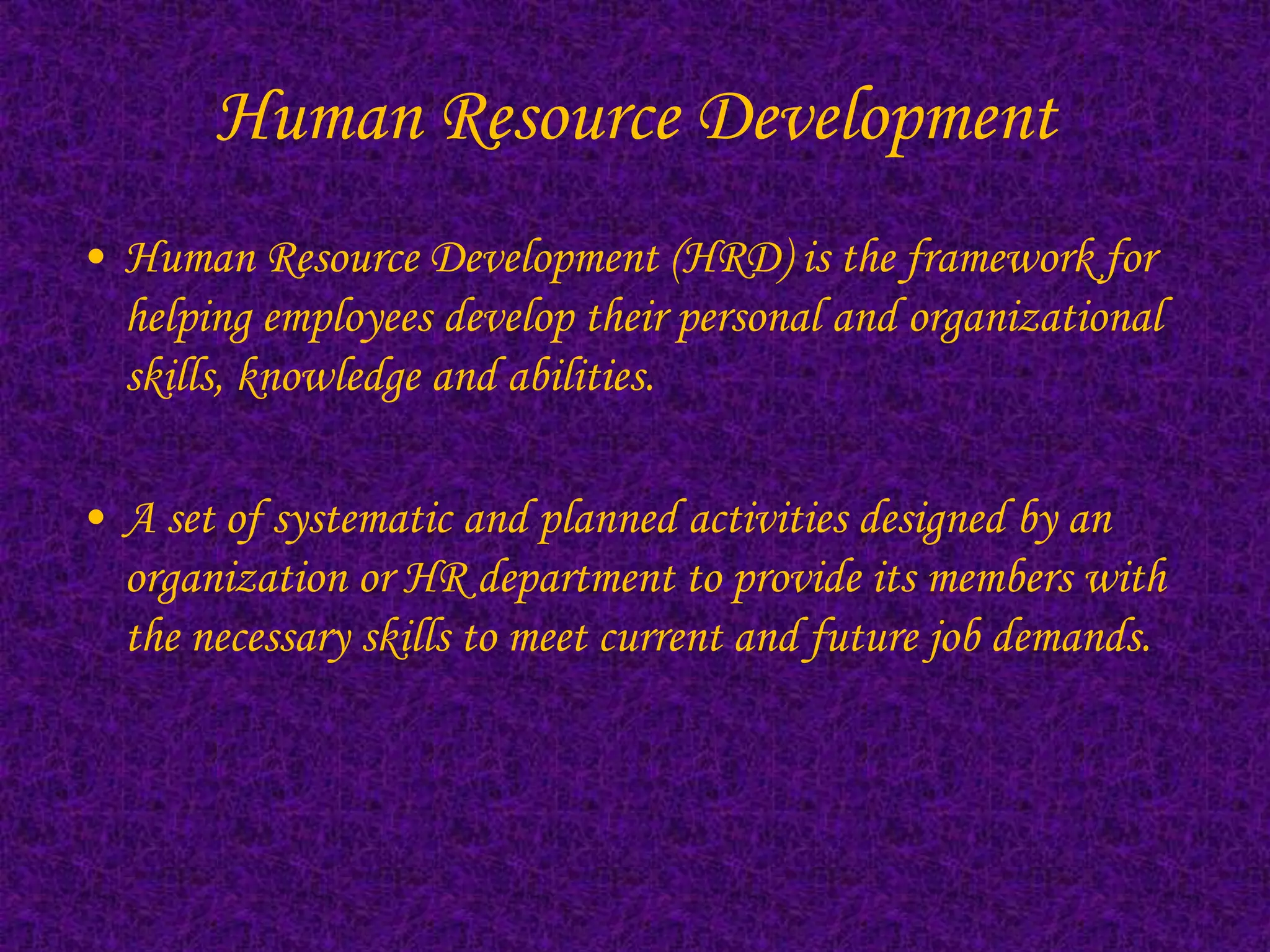 Human Resource Development (HRD) involves developing the skills, knowledge and abilities of employees through planned training and organizational development activities. HRD strategies integrate training, development and career development efforts to achieve individual and organizational goals. Major HRD strategies include communications, accountability, quality improvement, cost reduction, entrepreneurship, culture building, and systematic training. The goals of HRD are to enable employee capability, develop relationships between employees and supervisors, and integrate people development with organizational development.