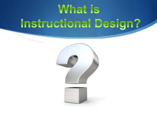 Instructional Design is the systematic process of analyzing learning needs and goals and developing instruction to ensure quality. It involves using learning and instructional theory to develop instructional specifications. The overall process includes analyzing learning needs and goals and creating a delivery system that meets those needs.