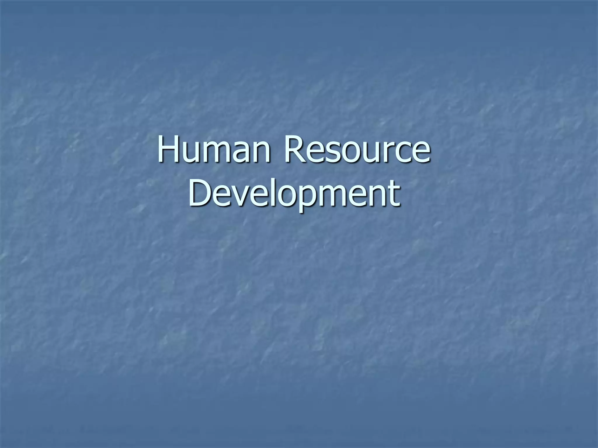 This document outlines the key topics covered in human resource development, including: the foundations of HRD and influences on employee behavior; learning approaches and assessing development needs; designing, implementing, and evaluating effective training programs; socializing and orienting employees; skills and technical training; coaching and performance management; employee counseling and wellness services; career management; management development; organizational development and change; and diversity training.