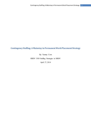 Contingency staffing has become a mainstay in permanent workforce strategies for many companies. There are several reasons for this, including lower costs since contingent workers do not require benefits or paid time off. Companies also gain flexibility with this staffing model. However, companies must develop strategies to integrate contingent workers and make them feel valued in order to maximize their performance and minimize risks like decreased loyalty. Human resources departments play a key role in developing these strategies through collaboration, clearly defining roles, onboarding processes, and effective communication with contingent staff.