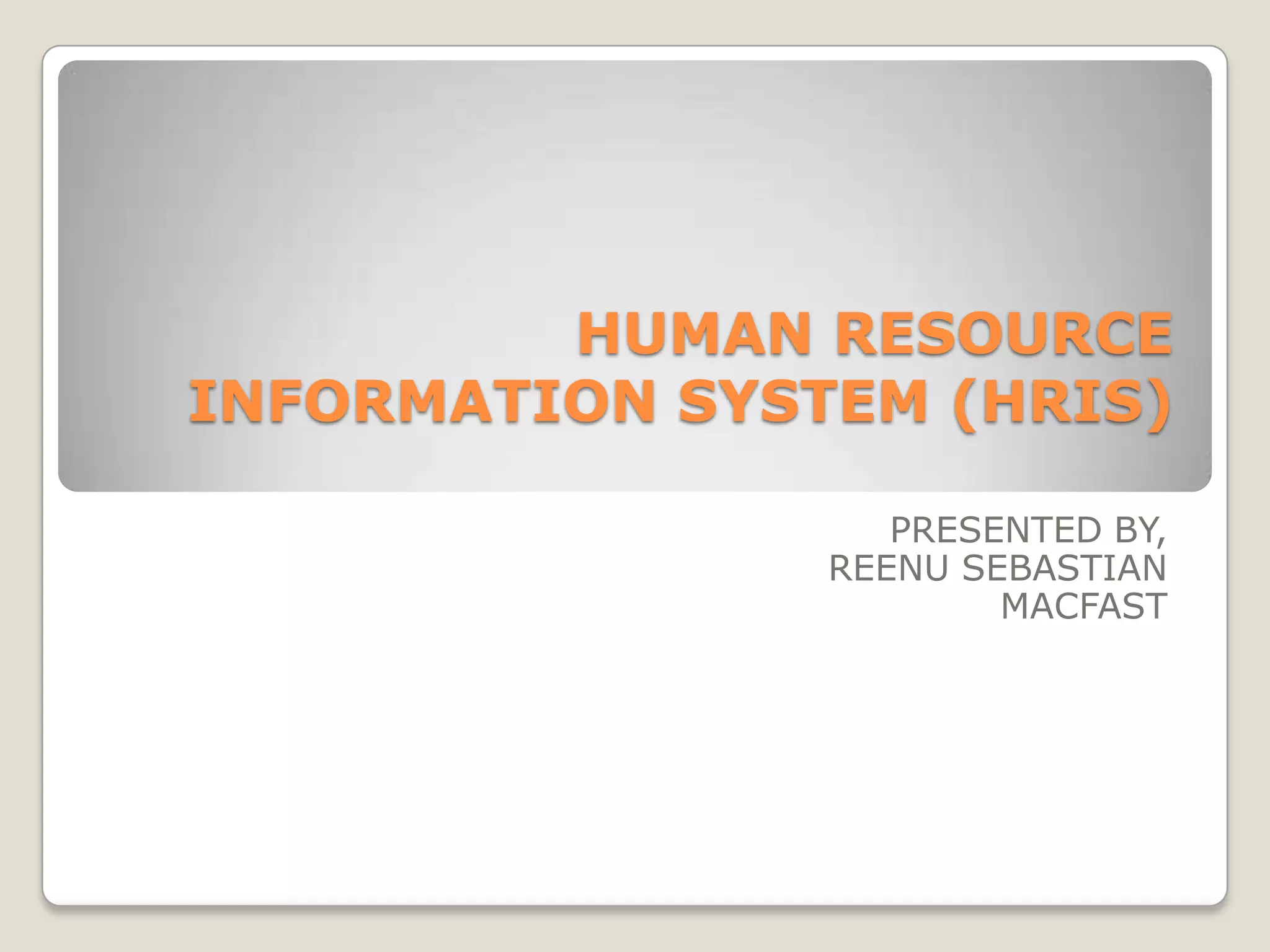 An HRIS is a software or online solution that handles data entry, tracking, and information needs for human resources, payroll, management, and accounting functions in a business. It typically manages all employee information, allows reporting and analysis of data, and integrates with payroll and financial systems. An effective HRIS tracks important details like attendance, pay history, performance reviews, and can help free up HR staff for more strategic work by allowing employees to update their own information. It provides data to support legal and ethical employee management.