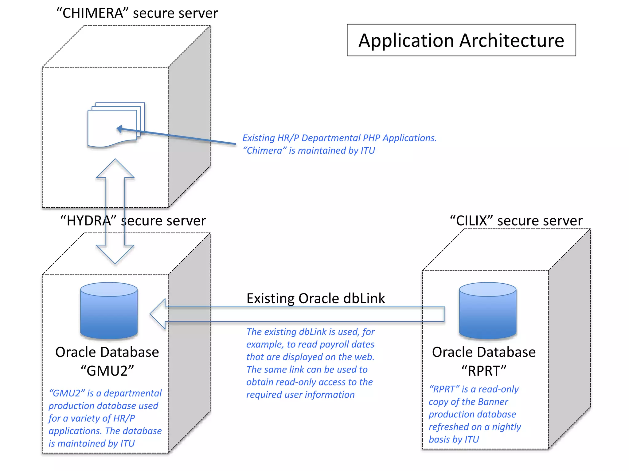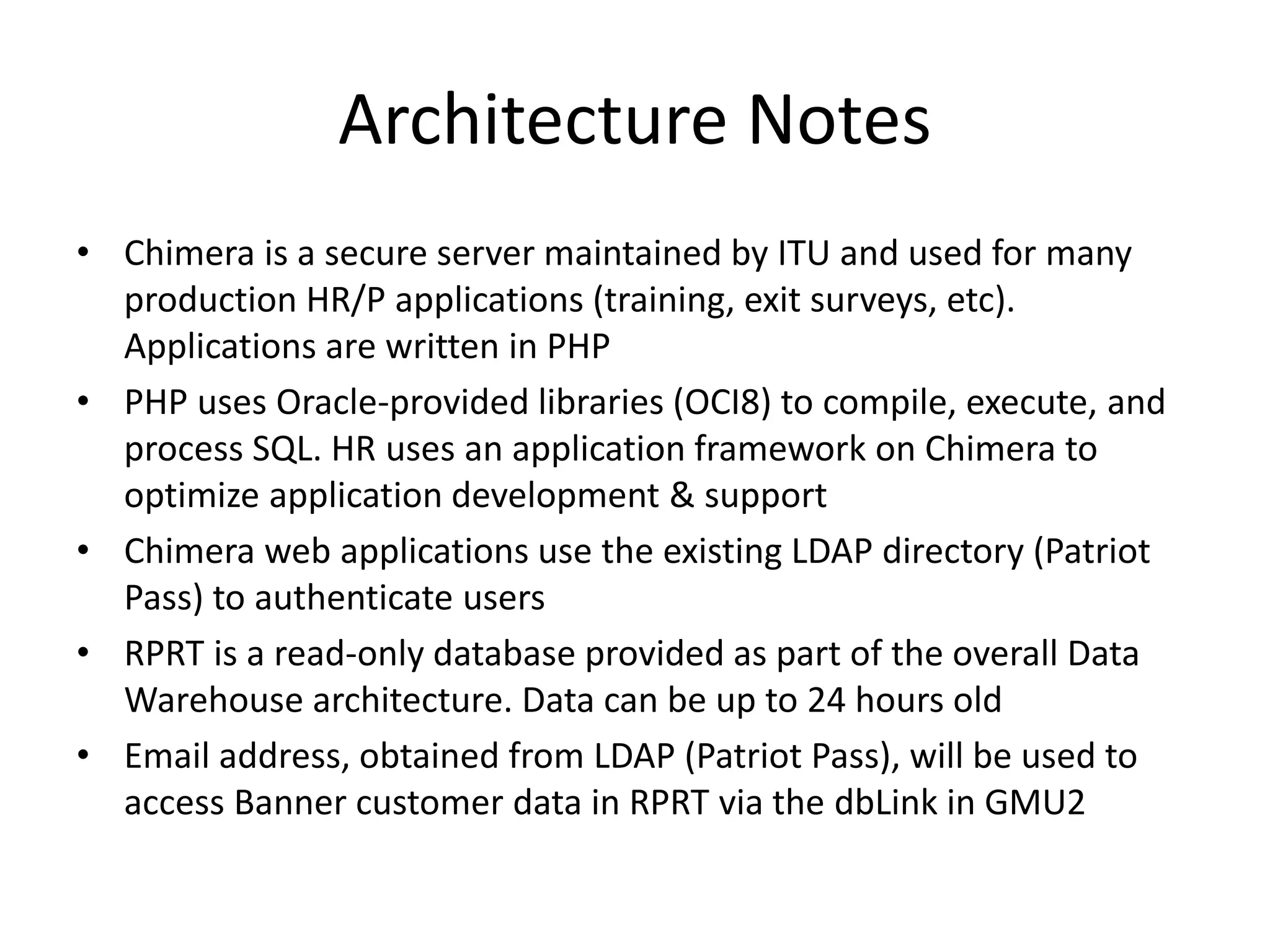 The document describes an existing Oracle database application architecture that includes two Oracle databases - GMU2 which is a departmental production database, and RPRT which is a read-only copy of the production Banner database refreshed nightly. An existing dbLink connects the two databases and is used by PHP applications on a secure server called Chimera to read payroll and user information from RPRT.