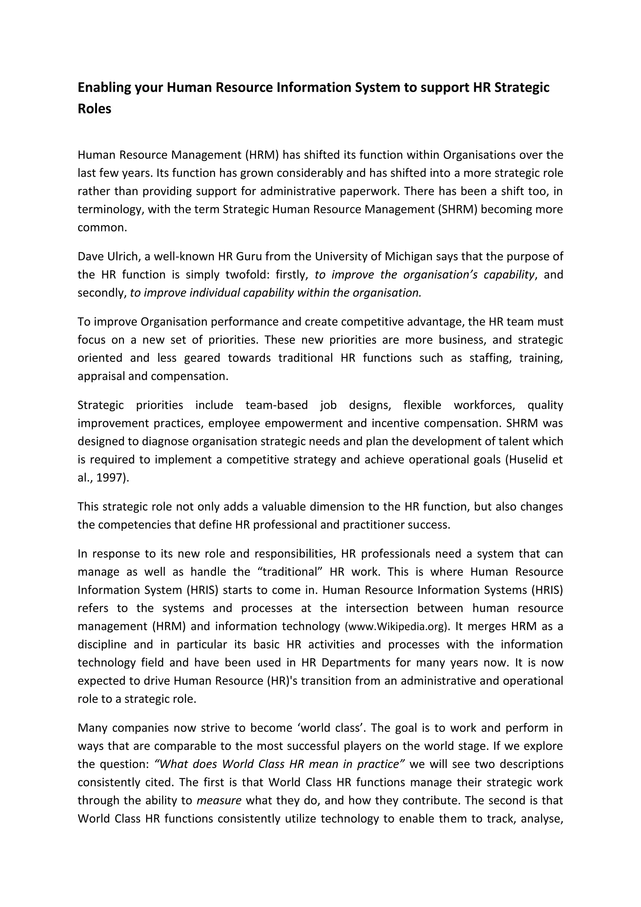 The document discusses the evolution of human resource management (HRM) towards a more strategic role, emphasizing the need for effective human resource information systems (HRIS) to support this transition. It highlights the importance of HRIS in managing transactional HR tasks while enabling strategic capabilities and emphasizes the need for organizations to optimize their use of HRIS. Ultimately, HRIS serves as a crucial tool for HR professionals, managers, and employees to enhance organizational performance and achieve competitive advantages.