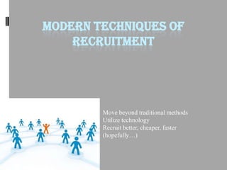 Modern recruitment techniques move beyond traditional methods by utilizing technology to recruit better, cheaper, and faster. Knowledge-based recruitment establishes anticipated skill requirements and maintains ongoing recruitment activity. E-recruitment uses web tools like job websites and company sites to advertise vacancies and allow job seekers to apply online. Other modern methods include scouting, employee referrals, networking, events, ESOPs, salary/perks, SMS, video networks, blogging, and casting a wider net to find candidates.