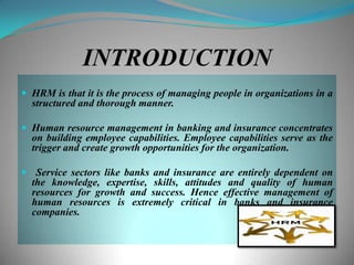 This document provides an overview of HR practices in banking and insurance sectors in India. It discusses HR practices at Bank of Baroda, a major public sector bank, and HDFC Standard Life Insurance, a private life insurance company. Some key HR practices discussed include recruitment, training, performance appraisal, and employee engagement initiatives. The conclusion compares the HR approaches between the two organizations and provides some suggestions.