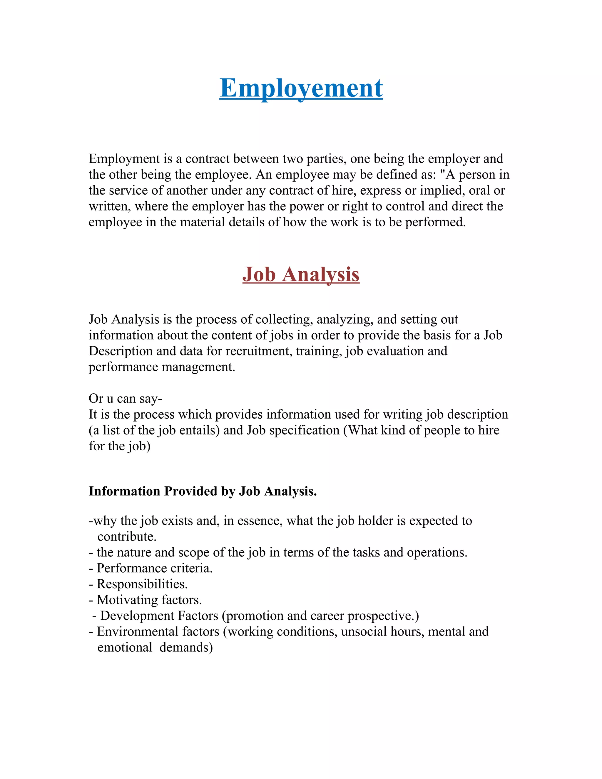[1] Employment involves contracts between employers and employees, with job analysis being the process of collecting and analyzing job information for purposes like job descriptions.