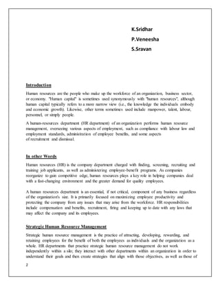 The document discusses human resource strategies at IBM. It begins by defining human resources and describing the functions of an HR department. It then discusses strategic human resource management and its focus on attracting, developing, rewarding and retaining employees to benefit both individuals and the organization. The document outlines the major functions of human resource managers, including managing the HR department, understanding employment laws, interacting with executive leadership, building employee relations, and more. It provides details on IBM's history and business activities.